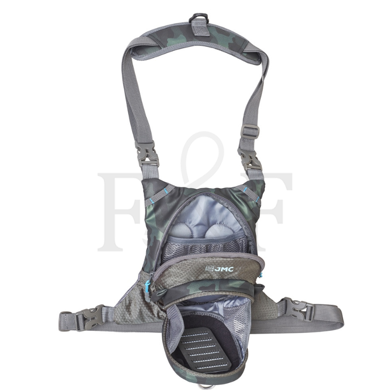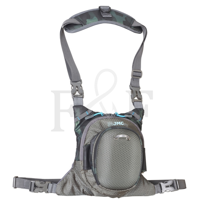 Mochila compacta de pecho con cierre magnético para un acceso ultrarrápido a un bolsillo con cremallera YKK®, compartimentos internos y un bolsillo de malla elástica. Tejido de camuflaje repelente al agua, reforzado con un tejido de panal para mayor durabilidad. Panel trasero acolchado con malla para mayor transpirabilidad. Refuerzo acolchado en el cuello con anilla en D para llevar una red de pesca. Se puede llevar como bandolera o como mochila de pecho para aguas profundas. Múltiples presillas para accesorios.