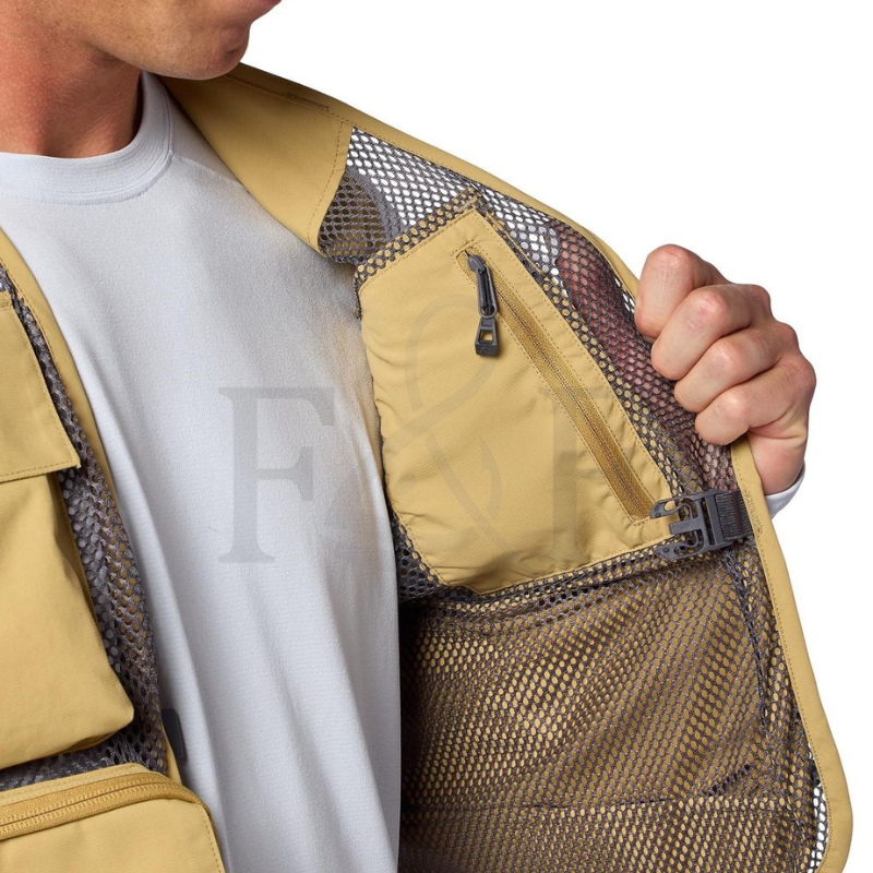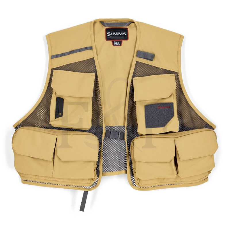 • Poly mesh main body construction for breathability and faster drying times • Durable nylon woven ripstop textile pockets and back panel allow you to organize your gear more efficiently • Four semi-structured lower flapped pockets and two YKK® zippered horizontal pockets for small and large fly box storage • Two flapped pockets on chest with Velcro® fly patch, mini D-ring accessory attachment, and a Hypalon retractor docking station which allows you to keep essential tools like nippers conveniently within reach • Daisy chain webbing on right shoulder for accessory attachments • Large capacity rear storage pocket for jackets, water bottle and meal storage • Internal chest pocket storage for licenses and glasses • Quick release buckle on mid-chest • “Third hand” rod holder and net D-ring to free up your hands when tying on new flies or landing a fish